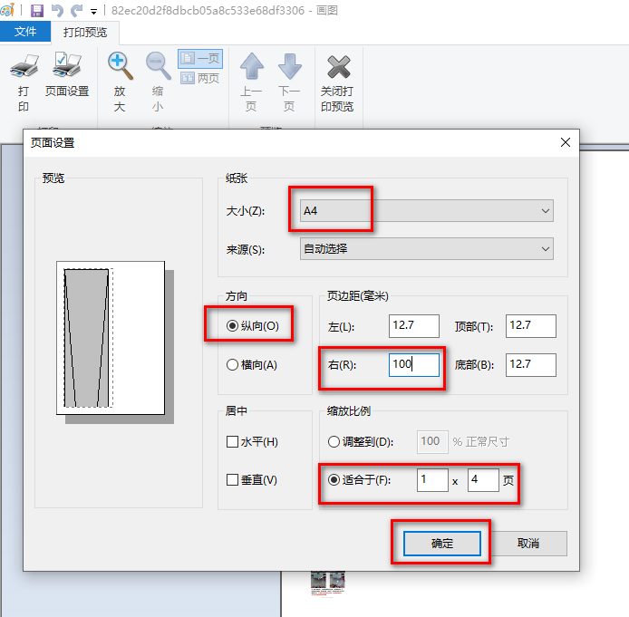 3、先 页面设置中 设置 打印A4 纸,纵向 ,分两栏就要把右边距设置为100,在适合于 设置 1 x 4,这里适合于根据左图缩略图看效果,然后确定,最关键是在打印时设置为只打印 奇数页;