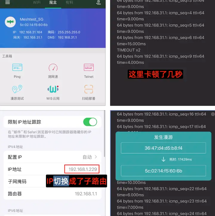 ▲ 第二次漫游的切换时间其实也挺快,但丢包比较多,还有就是两个网络之间切换的时候会有时卡顿、可能是需要重新DHCP获取内网IP地址造成的,这种方式不推荐,会造成网络丢包、网络卡顿。