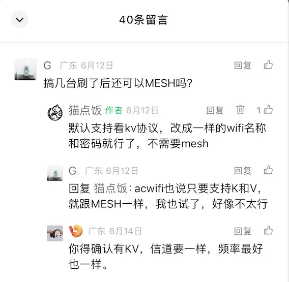 可以看到,Mesh组网和无缝漫游(快速切换)之间不是充分必要条件,仅仅是开启了Mesh组网肯定是支持kv协议而已,大部分路由器不开Mesh组网也是支持kv协议,所以会出现2个路由器同WiFi名和密码即可、Mesh不重要 的争论。