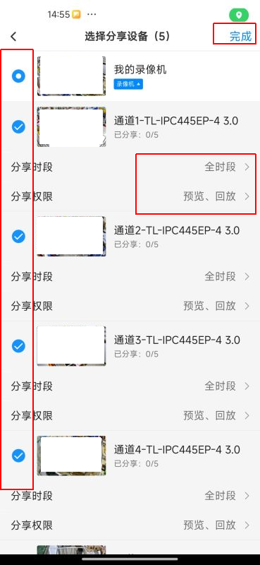 7、选择需要分享的摄像头、分享的时段、是否允许回放,然后点“完成”,