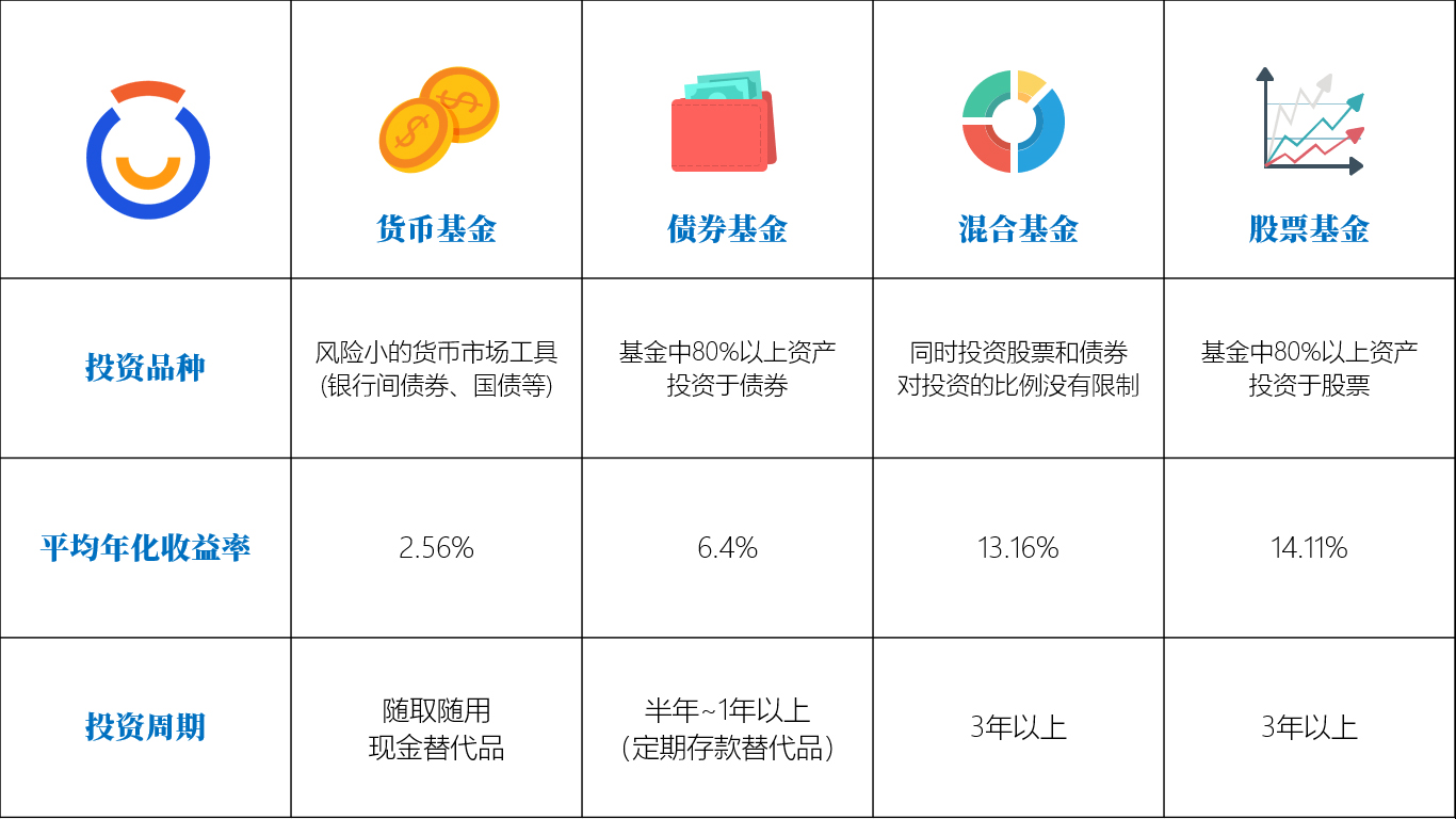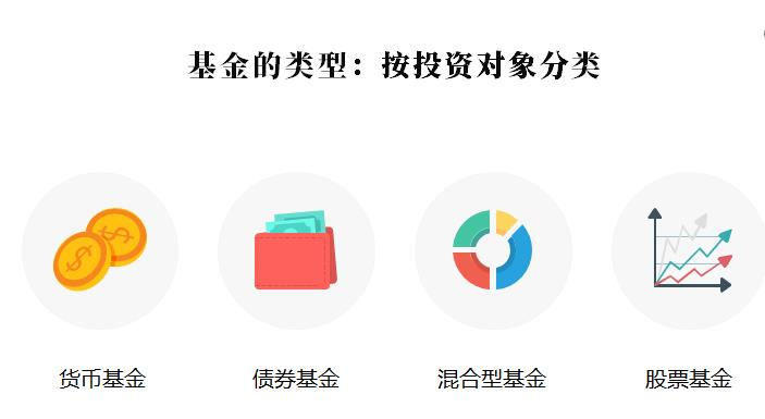 按照基金的【投资标的】去划分,可以将基金分为 4 类:货币基金、债券基金、混合基金、股票基金