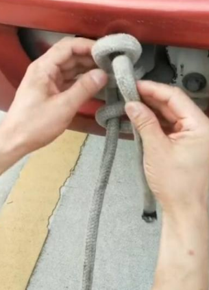 把底下右边的绳子从底下左边的绳子上转过去,然后把转过去的绳子再拉回来,将拉回来的绳子对折放到上面的绳圈中,拉进下面的绳子。