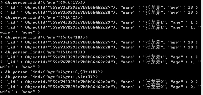 1、 $gt //大于 > ,$lt //小于 < ,$gte //大于等于 >= ,$lte //小于等于
