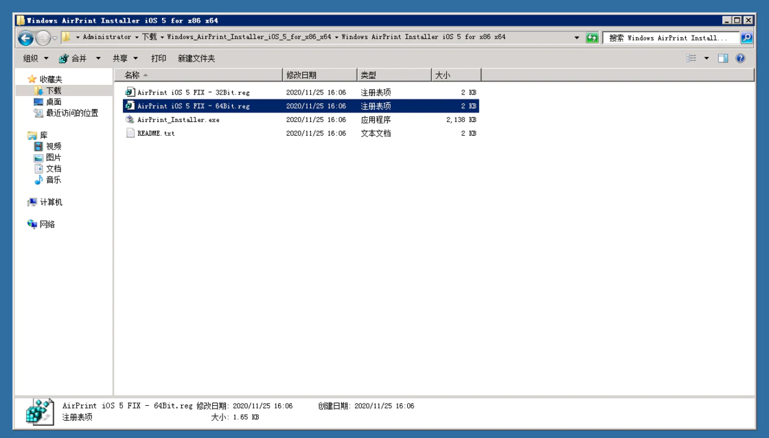 下面我们需要做的就是给这个 AirPrint for Windows 打上「补丁」:在前面解压缩的 AirPrint Installer 文件夹中找到 AirPrint iOS 5 FIX 对应的两个注册表文件,根据系统是 32 位还是 64位选择对应的版本并执行注册。